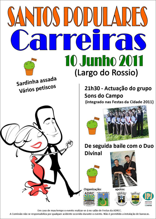 A Associação da Juventude Carreirense, em parceria com a Associação Desportiva Recreativa e Cultural de Carreiras, uniram esforços e organizaram mais uma edição dos Santos Populares, aberta a toda a população em geral das Carreiras. A animação esteve a cargo do grupo coral Sons do Campo e do Duo Divinal.